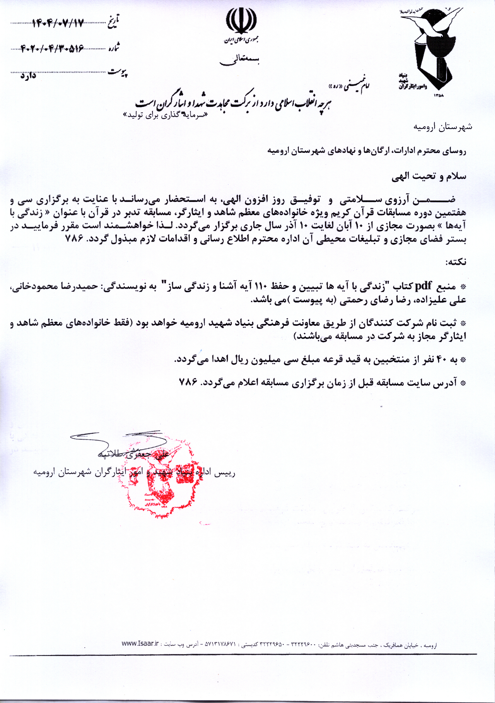 سی و هفتمین دوره مسابقات قرآن کریم ویژه خانواده های معظم شاهد و ایثارگر ي, 07/20/1404 - 09:15 | isarurmia سی و هفتمین دوره مسابقات قرآن کریم ویژه خانواده های معظم شاهد و ایثارگر اطلاعیهستاد دانشجویان شاهد و ایثارگر